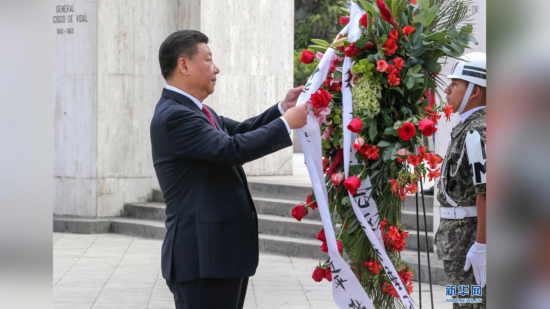 11月21日,國家主席習(xí)近平在利馬同秘魯總統(tǒng)庫琴斯基舉行會談。會談前,在庫琴斯基夫婦陪同下,習(xí)近平和彭麗媛向秘魯獨立先驅(qū)紀(jì)念碑敬獻花圈。新華社記者 丁林 攝2016-11-23