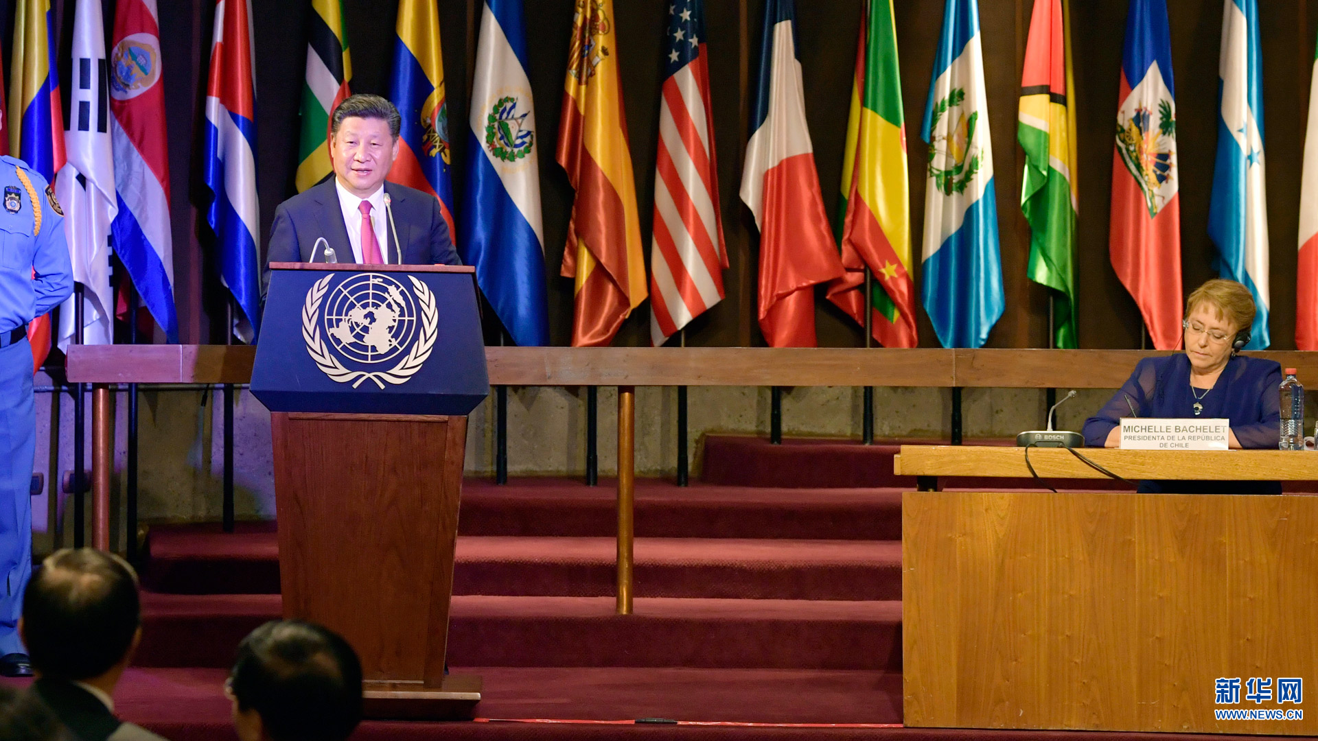 11月22日,國家主席習(xí)近平在圣地亞哥聯(lián)合國拉丁美洲和加勒比經(jīng)濟委員會總部出席中拉媒體領(lǐng)袖峰會開幕式。智利總統(tǒng)巴切萊特陪同出席。在熱烈的掌聲中,習(xí)近平發(fā)表題為《開創(chuàng)中拉媒體合作新局面》的致辭。新華社記者 王曄 攝2016-11-23