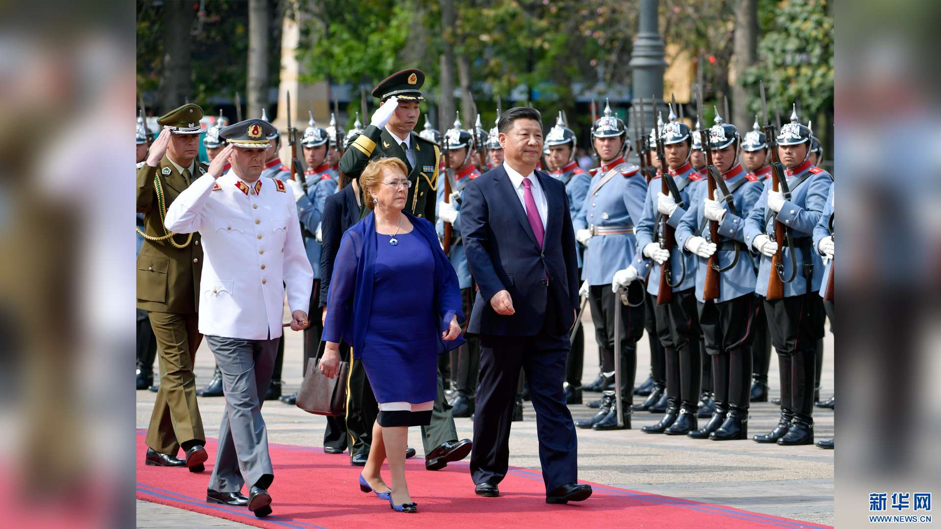 11月22日,國家主席習(xí)近平在圣地亞哥同智利總統(tǒng)巴切萊特舉行會談。這是會談前,習(xí)近平出席巴切萊特在憲法廣場舉行的隆重歡迎儀式。新華社記者 王曄 攝2016-11-23
