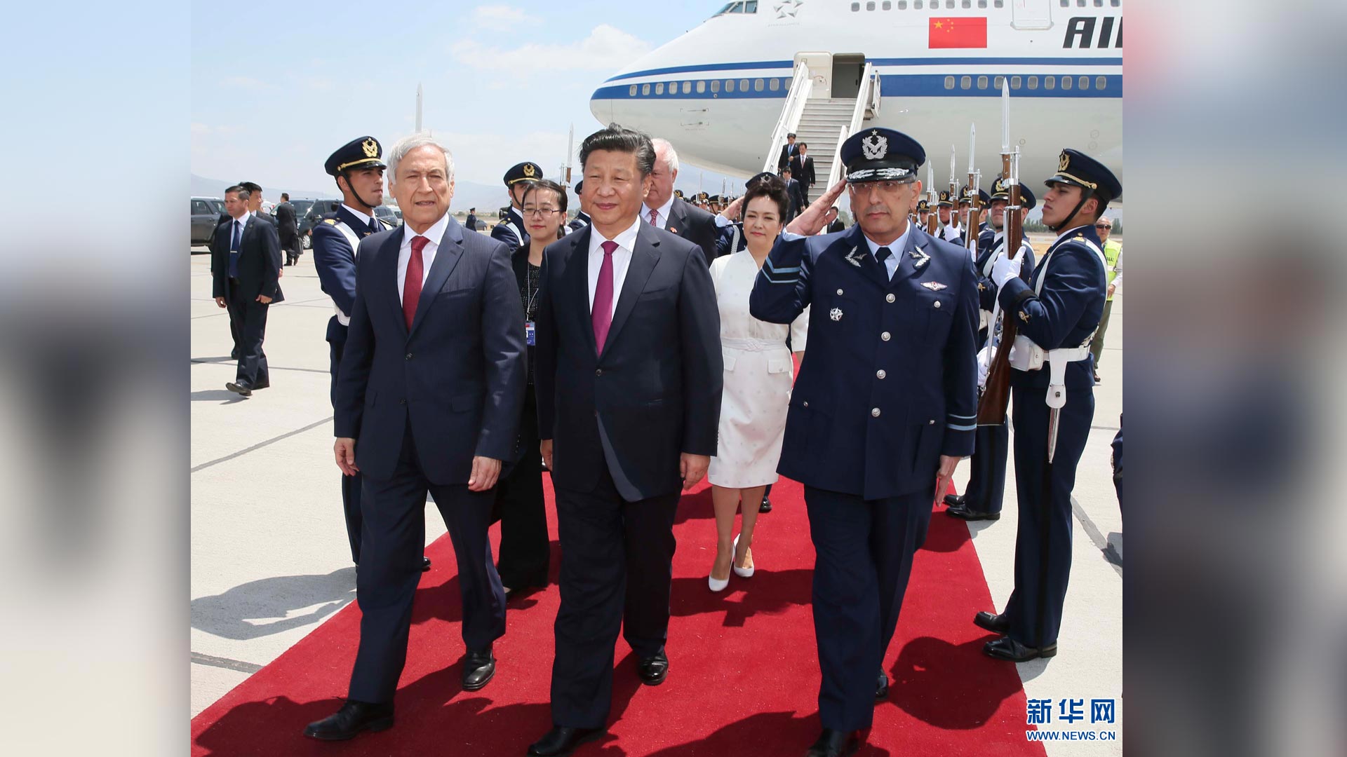 11月22日,國家主席習(xí)近平抵達圣地亞哥,對智利共和國進行國事訪問。智利外長穆尼奧斯等在機場迎接習(xí)近平和夫人彭麗媛。 新華社記者蘭紅光 攝2016-11-23