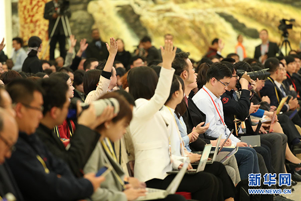 2017年10月17日下午,中國共產(chǎn)黨第十九次全國代表大會新聞發(fā)言人在人民大會堂三樓金色大廳舉行新聞發(fā)布會,并回答中外記者提問。圖為記者在現(xiàn)場踴躍提問。新華網(wǎng) 翟子赫 攝
