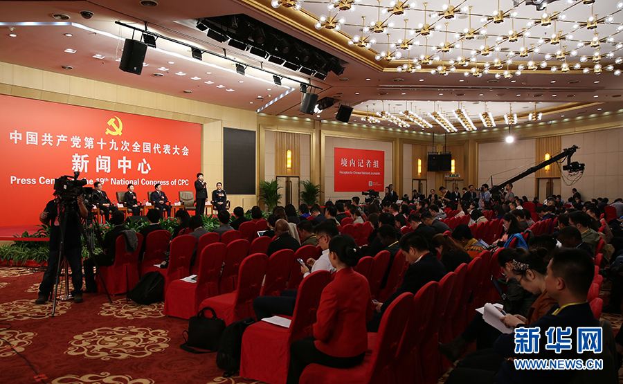 ??? 10月19日,十九大新聞中心舉辦集體采訪,邀請政法戰(zhàn)線代表談全面推進(jìn)依法治國。圖為采訪現(xiàn)場。新華網(wǎng) 郝廣鵬攝