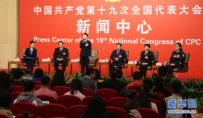 ??? 10月19日,十九大新聞中心舉辦集體采訪,邀請政法戰(zhàn)線代表談推進(jìn)全面依法治國。圖為采訪現(xiàn)場。新華網(wǎng) 郝廣鵬攝