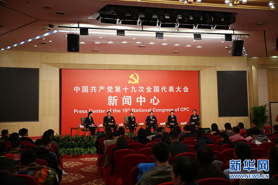 ??? 10月19日,十九大新聞中心舉辦集體采訪,邀請政法戰(zhàn)線代表談全面推進依法治國。圖為采訪現(xiàn)場。新華網(wǎng) 郝廣鵬攝