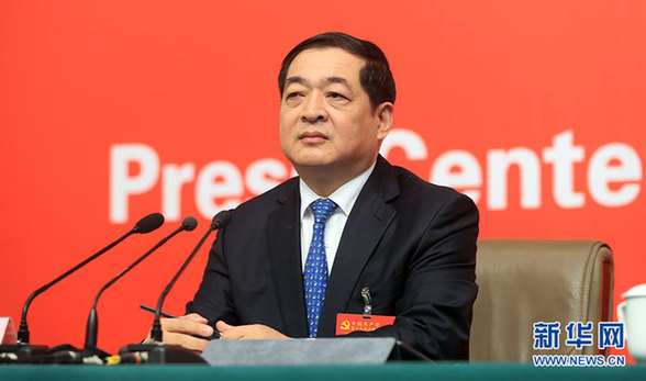 10月19日,十九大新聞中心舉辦集體采訪,邀請工信和通訊領(lǐng)域代表談走新型工業(yè)化道路。圖為山東省經(jīng)濟和信息化委員會黨組書記、主任錢煥濤。新華網(wǎng) 郝廣鵬攝