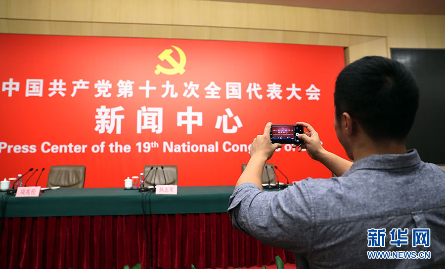 ??? 10月20日,十九大新聞中心舉行記者會,邀請中宣部、中央文明辦、文化部、新聞出版廣電總局相關(guān)負(fù)責(zé)人介紹加強(qiáng)思想道德和文化建設(shè)情況,并回答記者提問。圖為記者在現(xiàn)場拍攝。新華網(wǎng) 郝廣鵬 攝