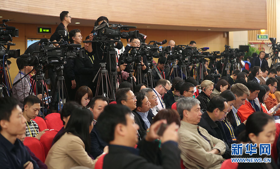 10月23日,十九大新聞中心舉辦記者招待會,邀請中央財經(jīng)領(lǐng)導(dǎo)小組辦公室副主任楊偉民,環(huán)境保護部黨組書記、部長李干杰介紹踐行綠色發(fā)展理念,建設(shè)美麗中國有關(guān)情況,并回答記者提問。圖為現(xiàn)場記者。新華網(wǎng) 郝廣鵬攝