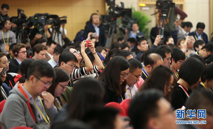 10月23日,十九大新聞中心舉辦記者招待會,邀請中央財經領導小組辦公室副主任楊偉民,環(huán)境保護部黨組書記、部長李干杰介紹踐行綠色發(fā)展理念,建設美麗中國有關情況,并回答記者提問。圖為現(xiàn)場記者。新華網(wǎng) 郝廣鵬攝