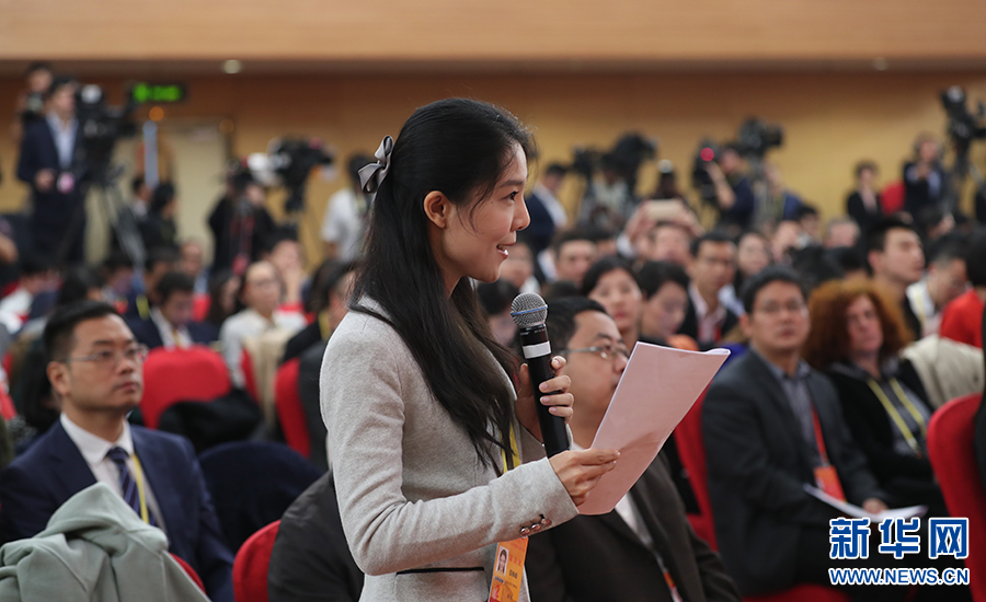 ? 10月26日上午10:00,中國共產(chǎn)黨第十九次全國代表大會新聞發(fā)言人在梅地亞賓館二層新聞發(fā)布廳召開專題新聞發(fā)布會,請有關方面負責人解讀十九大報告,并回答記者關心的問題。圖為中央人民廣播電臺記者提問。新華網(wǎng) 王成云 攝