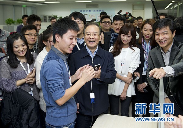 ??? 12月13日,國務(wù)院總理溫家寶到北京中關(guān)村考察并與部分企業(yè)負(fù)責(zé)人座談。這是溫家寶在百度公司考察時,試用手機(jī)語音搜索。 新華社記者黃敬文 攝