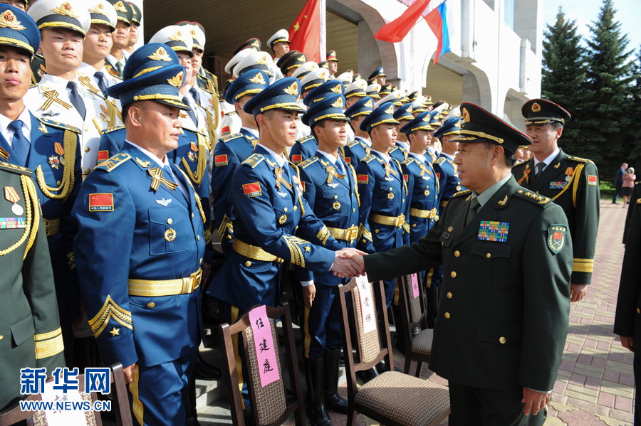 ??? 5月9日,在俄羅斯首都莫斯科,中共中央政治局委員、中央軍委副主席范長龍看望中國人民解放軍三軍儀仗隊(duì)官兵。受習(xí)近平主席委托,中共中央政治局委員、中央軍委副主席范長龍9日下午來到參加俄羅斯紀(jì)念衛(wèi)國戰(zhàn)爭勝利70周年慶典的我軍閱兵方隊(duì)駐地看望官兵,代表習(xí)主席和中央軍委向方隊(duì)官兵圓滿完成參閱任務(wù)表示祝賀,勉勵(lì)他們認(rèn)真總結(jié)經(jīng)驗(yàn),牢記強(qiáng)軍目標(biāo),獻(xiàn)身強(qiáng)軍實(shí)踐,為黨和人民再立新功。新華社記者戴天放攝??
