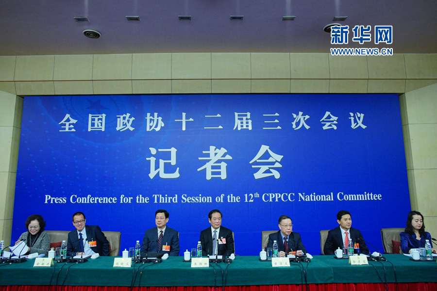 ?? 全國政協(xié)十二屆三次會議舉行記者會,邀請全國政協(xié)常委朱維群、黃潔夫和全國政協(xié)委員胡曉義、李彥宏、俞敏洪等談促進民生改善與社會和諧穩(wěn)定,并回答記者提問。圖為記者會現(xiàn)場。新華網(wǎng)/中國政府網(wǎng)?郭小天 攝