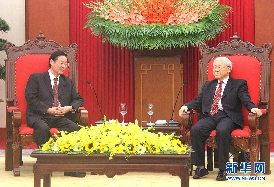 12月22日,越南共產(chǎn)黨中央總書記阮富仲(右)在河內(nèi)會見率中共代表團出席第十二次中越兩黨理論研討會的中共中央政治局委員、中央書記處書記、中宣部部長劉奇葆。新華社記者樂艷娜攝