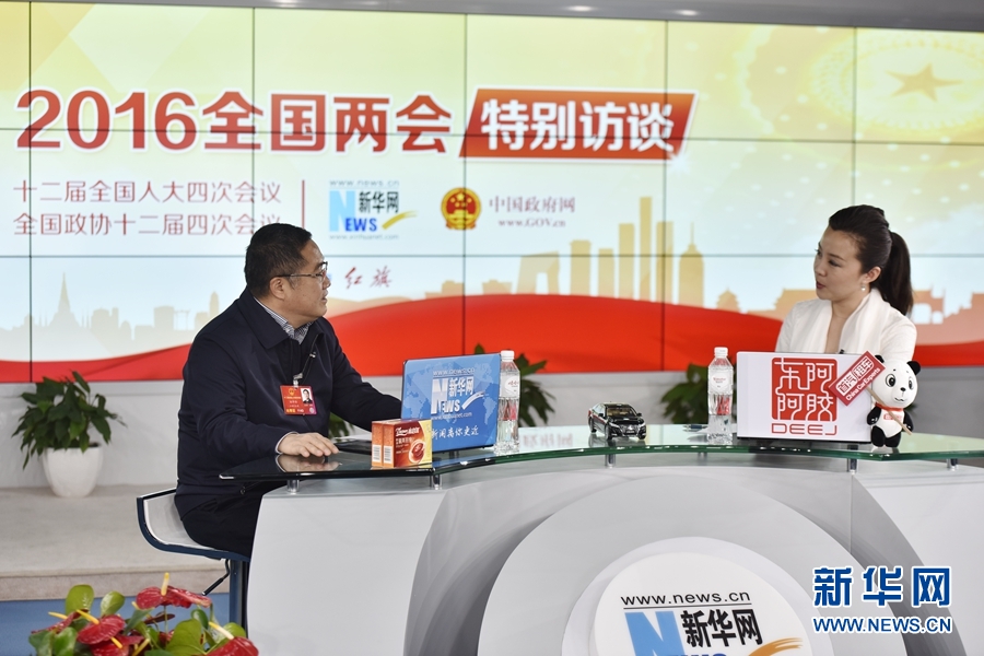 2016年3月12日,全國人大代表、正邦集團董事局主席、總裁林印孫做客新華網(wǎng)兩會訪談直播間。圖為訪談進行時。新華網(wǎng) 郭小天 攝