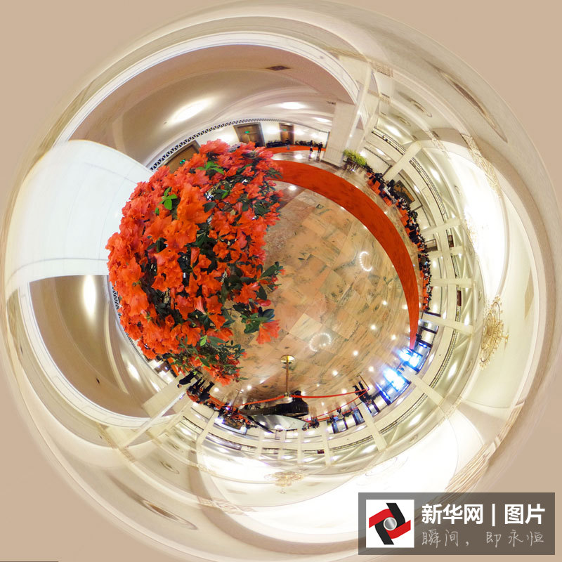 ??? 兩會(huì)期間,人民大會(huì)堂里溫暖如春,杜鵑花、迎春花等春花競相開放,記者用360度球形全景的特殊視角展現(xiàn)人民大會(huì)堂里春花開放的美景。圖片來源:視覺中國