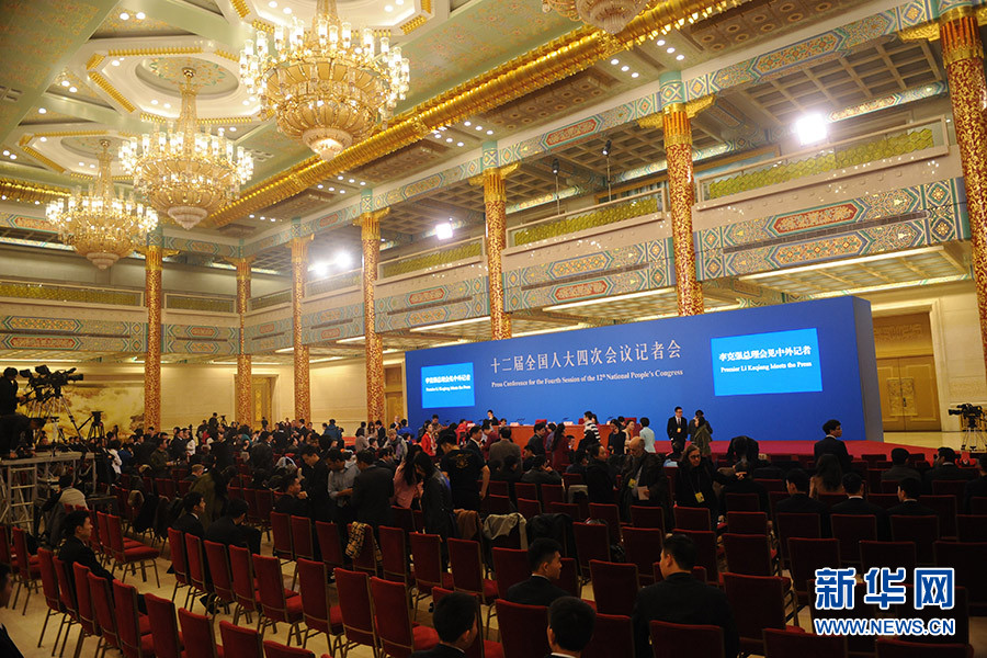 3月16日上午,國務(wù)院總理李克強在人民大會堂三樓金色大廳會見采訪十二屆全國人大四次會議的中外記者并回答記者提出的問題。圖為記者在準備工作。新華網(wǎng)/中國政府網(wǎng) 陳杰攝