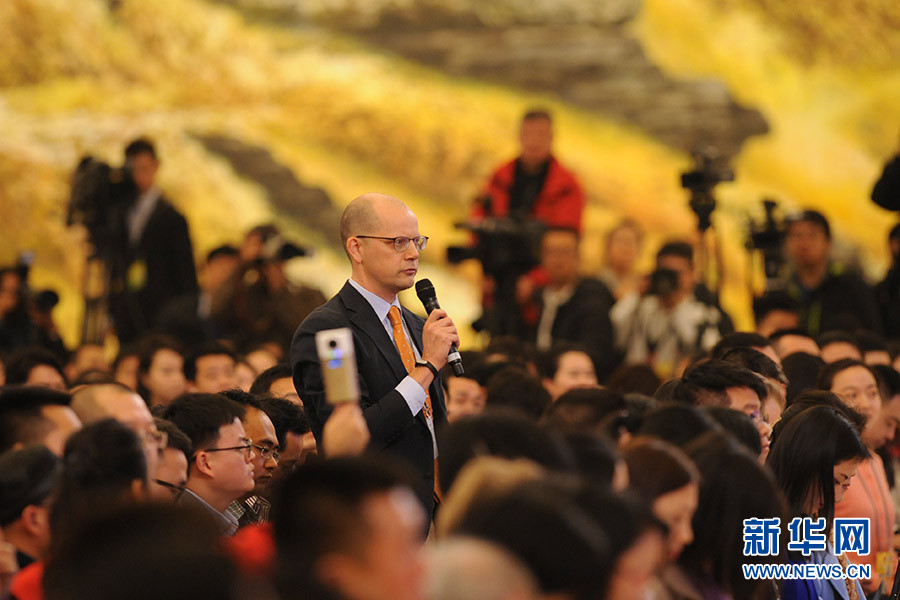 3月16日上午,國(guó)務(wù)院總理李克強(qiáng)在人民大會(huì)堂三樓金色大廳會(huì)見(jiàn)采訪十二屆全國(guó)人大四次會(huì)議的中外記者并回答記者提出的問(wèn)題。圖為彭博新聞社記者提問(wèn)。新華網(wǎng)/中國(guó)政府網(wǎng) 陳杰攝
