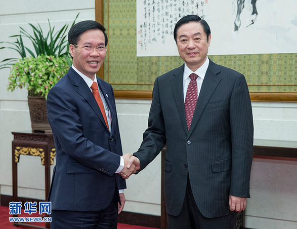 1月13日,中共中央政治局委員、中央書記處書記、中宣部部長(zhǎng)劉奇葆在北京會(huì)見越共中央政治局委員、中央書記處書記、中央宣教部部長(zhǎng)武文賞。新華社記者 崔新鈺 攝