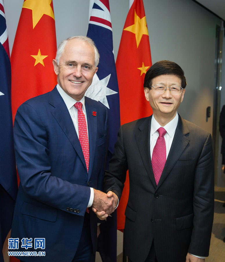 4月21日,正在澳大利亞訪問的中共中央政治局委員、中央政法委書記孟建柱(右)在悉尼會(huì)見澳總理特恩布爾。 新華社發(fā)(朱宏業(yè)攝)