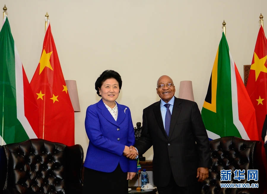 4月25日,南非總統(tǒng)祖馬(右)在比勒陀利亞總統(tǒng)官邸會見正在對南非進行正式訪問并出席中南高級別人文交流機制首次會議的中國國務院副總理劉延東。 新華社記者 翟健嵐 攝