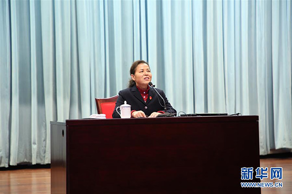 孫金娣組織“貫徹十九大,聽總書記話,永遠跟黨走”黨員群眾大會,并進行宣講(11月10日攝)。 新華社記者楊紹功攝