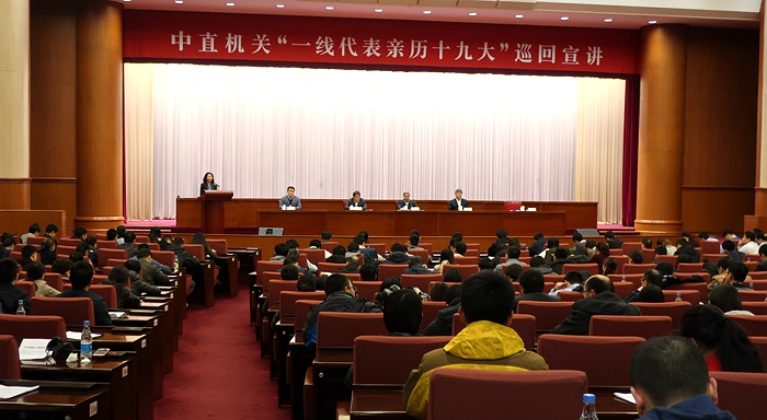 11月14日,中直機(jī)關(guān)“一線代表親歷十九大”巡回宣講首場報(bào)告會(huì)在北京全國政協(xié)機(jī)關(guān)會(huì)議樓舉行。新華網(wǎng) 聶晨靜 攝