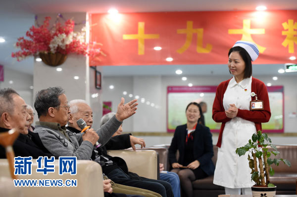 在重慶市青杠老年護(hù)養(yǎng)中心,趙慶華像拉家常一樣,給老人們講起十九大精神(11月1日攝)。新華社記者 唐奕 攝