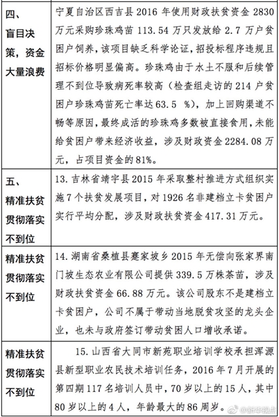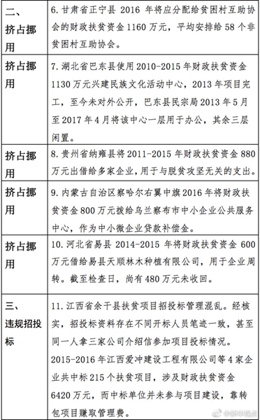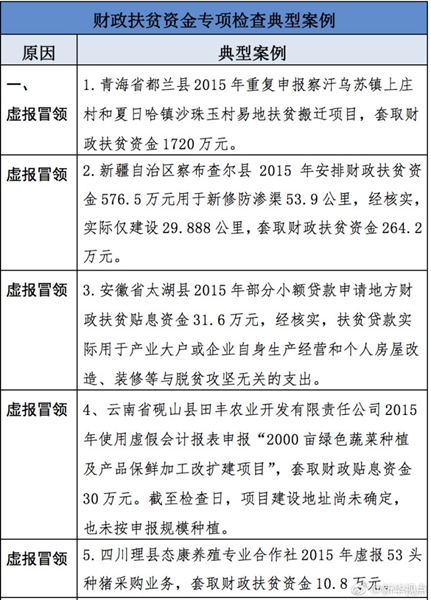 “發(fā)現(xiàn)一起、查處一起、絕不姑息!”財政部監(jiān)督檢查局有關(guān)負(fù)責(zé)人指出,此次檢查發(fā)現(xiàn)了一批違法違規(guī)問題,本著“零容忍”態(tài)度已進(jìn)行了嚴(yán)肅處理。從檢查發(fā)現(xiàn)問題中的一些典型案例看,虛報冒領(lǐng)、擠占挪用、違規(guī)招投標(biāo)、盲目決策導(dǎo)致資金大量浪費(fèi)、精準(zhǔn)扶貧貫徹落實不到位是當(dāng)前濫用扶貧資金的主要問題所在。