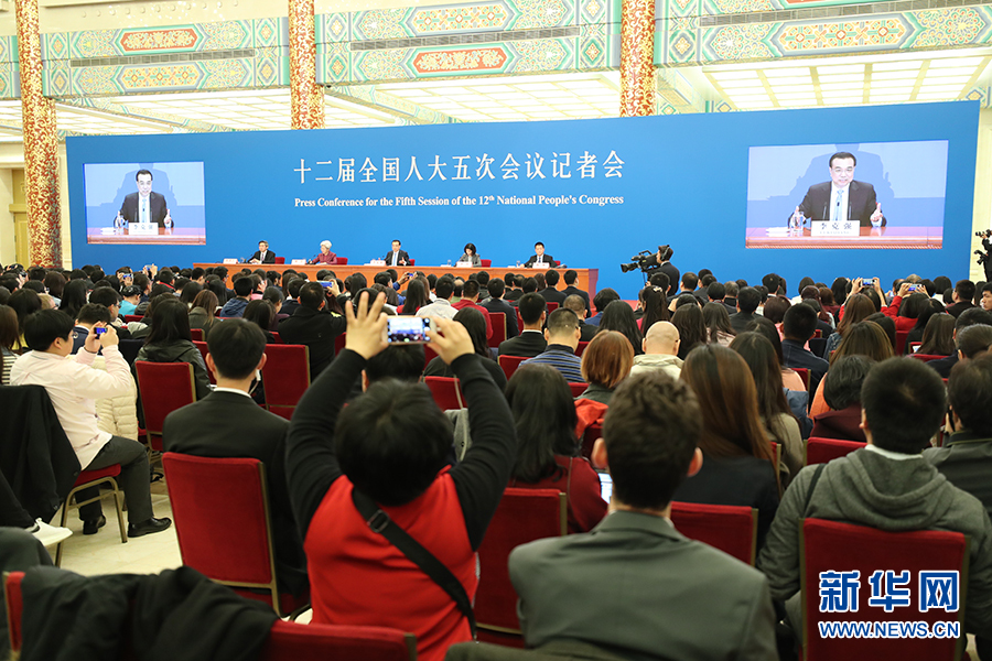 3月15日上午,國務(wù)院總理李克強(qiáng)在人民大會堂三樓金色大廳會見采訪十二屆全國人大五次會議的中外記者并回答記者提出的問題。圖為記者會正在進(jìn)行。新華網(wǎng)/中國政府網(wǎng) 翟子赫 攝?