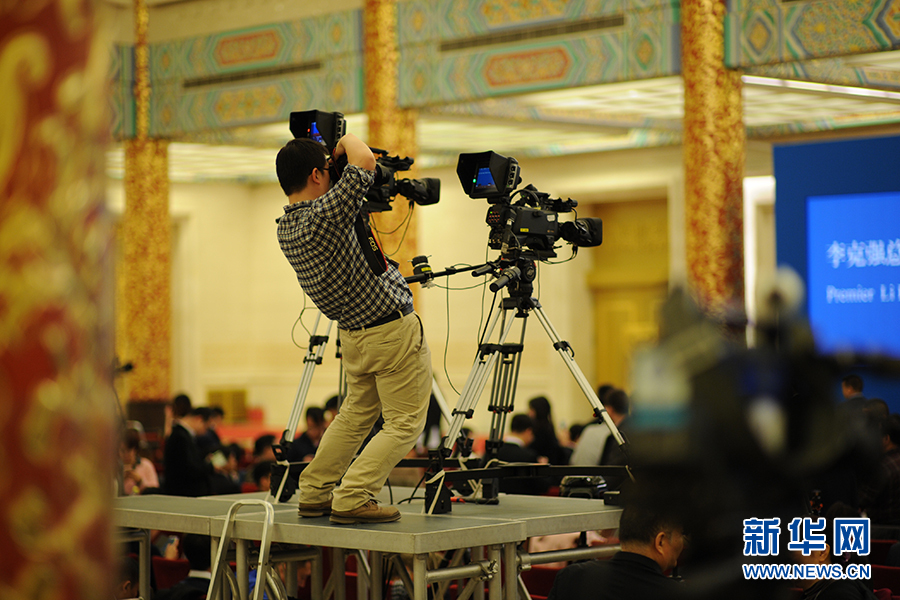 3月15日上午,國務(wù)院總理李克強(qiáng)在人民大會(huì)堂三樓金色大廳會(huì)見采訪十二屆全國人大五次會(huì)議的中外記者并回答記者提出的問題。圖為記者會(huì)一角的攝影記者。新華網(wǎng)/中國政府網(wǎng)?孫韜 攝?