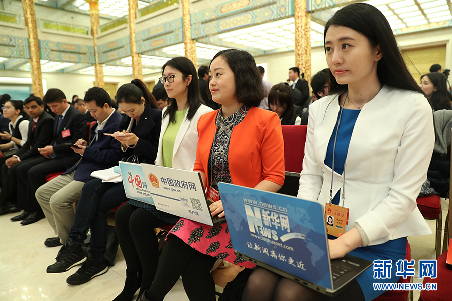 3月15日上午,國務院總理李克強在人民大會堂三樓金色大廳會見采訪十二屆全國人大五次會議的中外記者并回答記者提出的問題。圖為新華網(wǎng)記者在記者會現(xiàn)場。新華網(wǎng)/中國政府網(wǎng) 翟子赫 攝?