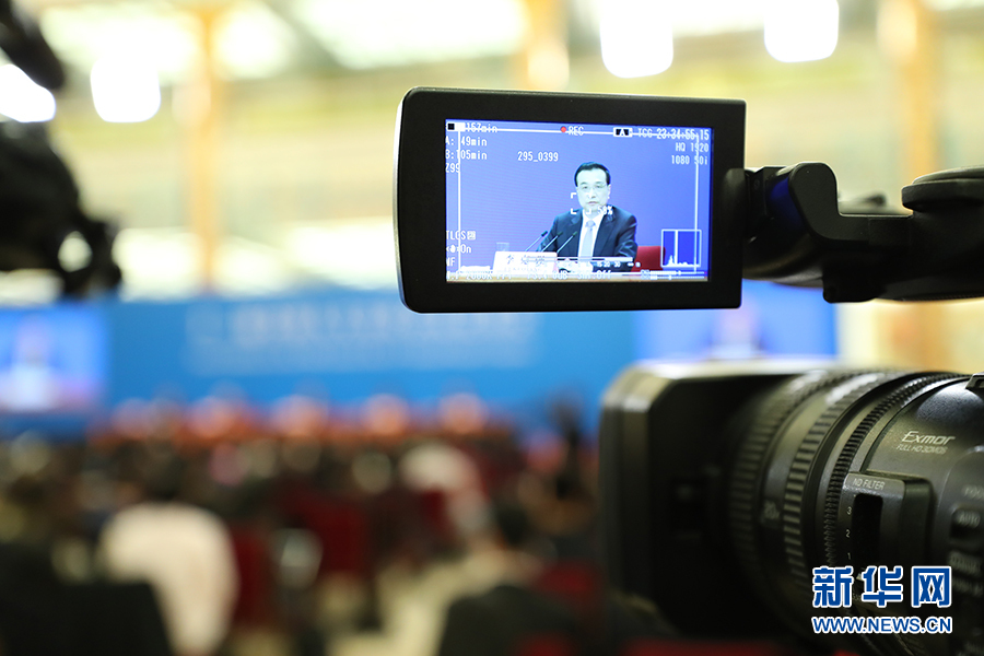 3月15日上午,國務(wù)院總理李克強(qiáng)在人民大會(huì)堂三樓金色大廳會(huì)見采訪十二屆全國人大五次會(huì)議的中外記者并回答記者提出的問題。圖為記者會(huì)現(xiàn)場。新華網(wǎng)/中國政府網(wǎng) 翟子赫 攝?
