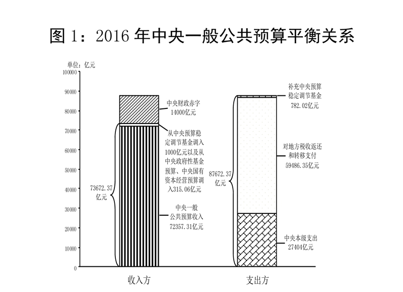 中央一般公共預(yù)算收入72357.31億元,為調(diào)整預(yù)算的100%,比2015年同口徑增長(zhǎng)1.2%。加上從中央預(yù)算穩(wěn)定調(diào)節(jié)基金調(diào)入1000億元,從中央政府性基金預(yù)算、中央國(guó)有資本經(jīng)營(yíng)預(yù)算調(diào)入315.06億元,收入總量為73672.37億元。中央一般公共預(yù)算支出86890.35億元(其中,中央本級(jí)支出27404億元,中央對(duì)地方稅收返還和轉(zhuǎn)移支付59486.35億元),完成調(diào)整預(yù)算的99.1%,增長(zhǎng)4.5%。加上補(bǔ)充中央預(yù)算穩(wěn)定調(diào)節(jié)基金782.02億元,支出總量為87672.37億元。收支總量相抵,中央財(cái)政赤字14000億元,與預(yù)算持平。2016年中央預(yù)備費(fèi)預(yù)算500億元,實(shí)際支出146.1億元,剩余353.9億元全部轉(zhuǎn)入中央預(yù)算穩(wěn)定調(diào)節(jié)基金。2016年末,中央財(cái)政國(guó)債余額120066.75億元,控制在年度預(yù)算限額125908.35億元以?xún)?nèi);中央預(yù)算穩(wěn)定調(diào)節(jié)基金余額2678.06億元(含通過(guò)收回中央財(cái)政結(jié)轉(zhuǎn)資金補(bǔ)充1501.83億元)。