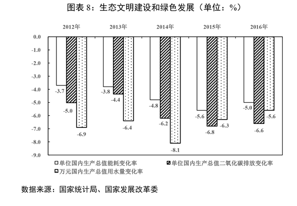 (七)加強(qiáng)生態(tài)環(huán)境保護(hù)和能源資源節(jié)約,綠色發(fā)展初見成效。單位國(guó)內(nèi)生產(chǎn)總值能耗和二氧化碳排放量分別下降5%和6.6%,超額完成全年目標(biāo),化學(xué)需氧量、氨氮、二氧化硫、氮氧化物排放量預(yù)計(jì)分別下降2.6%、2.9%、5.6%、4.0%,地級(jí)及以上城市空氣質(zhì)量?jī)?yōu)良天數(shù)比例同比提高2.1個(gè)百分點(diǎn),74個(gè)重點(diǎn)城市細(xì)顆粒物(PM2.5)年均濃度下降9.1%,地表水達(dá)到或好于Ⅲ類水體比例同比提高1.8個(gè)百分點(diǎn)、劣Ⅴ類水體比例同比下降1.1個(gè)百分點(diǎn),萬元國(guó)內(nèi)生產(chǎn)總值用水量下降5.6%。
