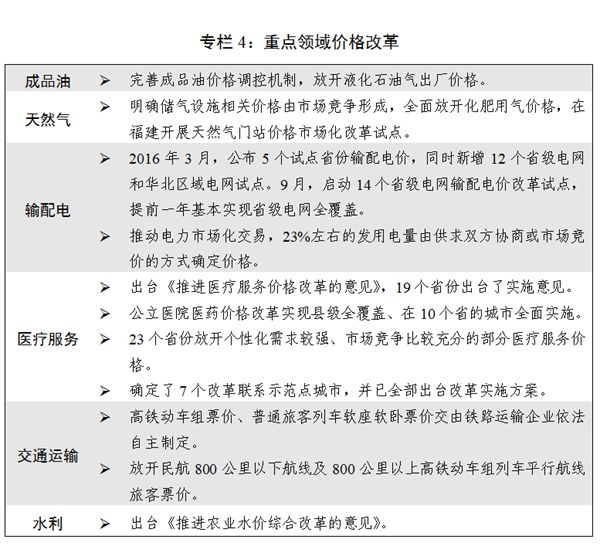 三是價(jià)格改革繼續(xù)深化。輸配電價(jià)改革試點(diǎn)實(shí)現(xiàn)所有省級(jí)電網(wǎng)全覆蓋。建立天然氣管道運(yùn)輸定價(jià)新機(jī)制,占消費(fèi)總量80%以上的非居民用氣門站價(jià)格主要由市場(chǎng)主導(dǎo)形成。石油天然氣交易市場(chǎng)加快發(fā)展。90%左右的城市已推廣居民階梯水電氣價(jià)。全面推進(jìn)醫(yī)療服務(wù)價(jià)格改革。鐵路、民航旅客票價(jià)市場(chǎng)化程度明顯提高。農(nóng)業(yè)水價(jià)綜合改革穩(wěn)步推進(jìn)。完善稻谷和小麥最低收購(gòu)價(jià)政策,棉花、大豆目標(biāo)價(jià)格改革試點(diǎn)深入推進(jìn)。