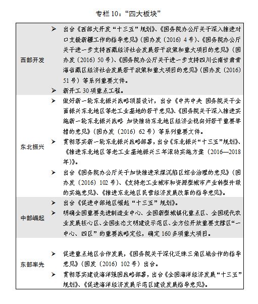 二是區(qū)域發(fā)展總體戰(zhàn)略和差別化區(qū)域政策深入實(shí)施。加快新一輪西部大開發(fā),一批重大標(biāo)志性工程開工建設(shè),中西部地區(qū)經(jīng)濟(jì)繼續(xù)保持較快增長(zhǎng)。出臺(tái)實(shí)施新一輪東北振興戰(zhàn)略和若干重大政策舉措,國(guó)企改革、投資營(yíng)商環(huán)境改善等重點(diǎn)領(lǐng)域改革取得新進(jìn)展。明確中部地區(qū)“一中心、四區(qū)”重要戰(zhàn)略定位,長(zhǎng)江中游城市群重要增長(zhǎng)極作用強(qiáng)化。東部地區(qū)轉(zhuǎn)型升級(jí)、開放創(chuàng)新、陸海統(tǒng)籌優(yōu)勢(shì)持續(xù)發(fā)揮,區(qū)域發(fā)展新動(dòng)能新亮點(diǎn)不斷涌現(xiàn)。出臺(tái)促進(jìn)區(qū)域協(xié)調(diào)發(fā)展的指導(dǎo)意見,差別化區(qū)域政策體系持續(xù)完善。國(guó)家綜合配套改革試驗(yàn)區(qū)、國(guó)家級(jí)新區(qū)及各類開發(fā)區(qū)、承接產(chǎn)業(yè)轉(zhuǎn)移示范區(qū)、產(chǎn)城融合示范區(qū)、臨空經(jīng)濟(jì)示范區(qū)等重要功能平臺(tái)建設(shè)有序推進(jìn)。加快革命老區(qū)、民族地區(qū)、邊疆地區(qū)和集中連片特困地區(qū)脫貧攻堅(jiān)。完善支持政策措施,推進(jìn)新疆、西藏、四省藏區(qū)經(jīng)濟(jì)社會(huì)發(fā)展和長(zhǎng)治久安。