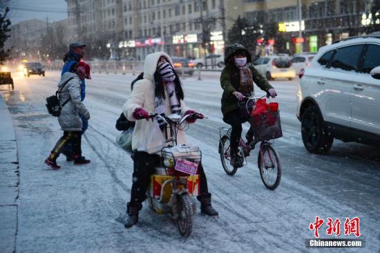 1月6日晚,內(nèi)蒙古呼和浩特市迎來2018年首場(chǎng)降雪,路面濕滑,民眾出行受到一定影響。中新社記者 劉文華 攝
