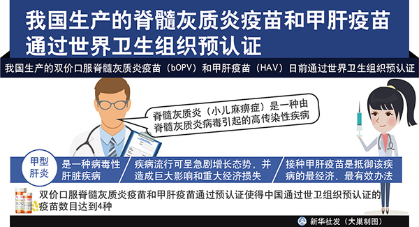 圖表:我國生產(chǎn)的脊髓灰質炎疫苗和甲肝疫苗通過世界衛(wèi)生組織預認證 新華社發(fā) 大巢制圖