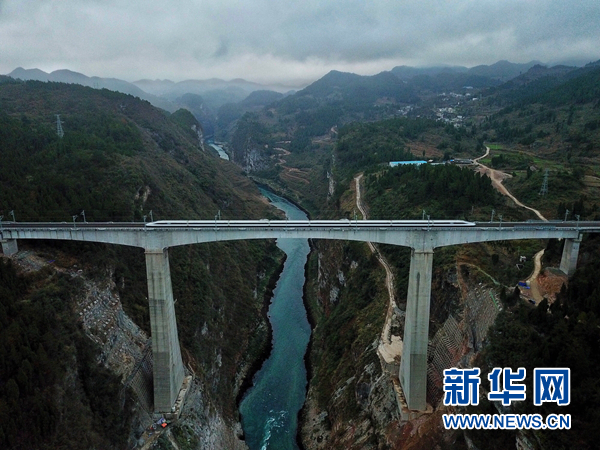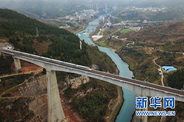 1月25日,渝貴鐵路從貴陽北到重慶西的D8592次首發(fā)動車經(jīng)過遵義市境內(nèi)的烏江大橋。 當日,設計時速200公里的渝貴鐵路全線開通運營。新華社記者 劉續(xù)攝