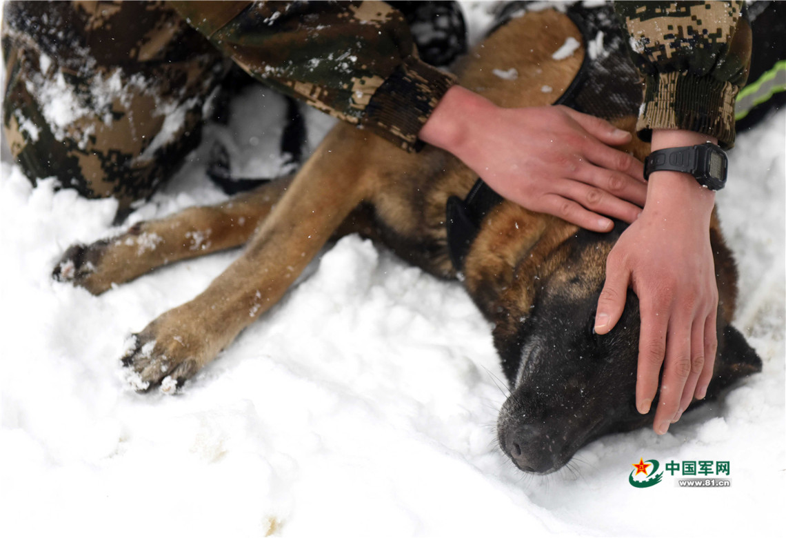 1月27日,武警安徽總隊(duì)機(jī)動(dòng)支隊(duì)警犬班班長(zhǎng)王營(yíng)廣與警犬“魯克”一起在雪地嬉戲。