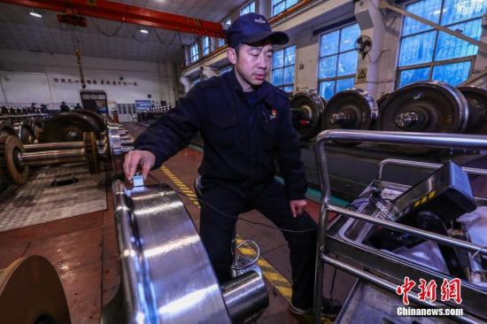 資料圖:列車“修腳師在對列車車輪進(jìn)行探傷檢查。中新社記者 張暢 攝