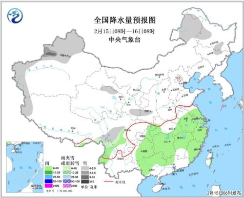 全國降水量預(yù)報(bào)圖(2月15日08時-16日08時)