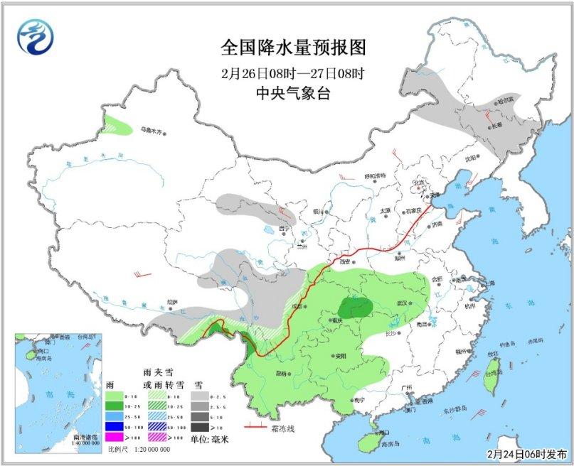 25日08時至26日08時,青藏高原中部和南部等地有小雪或雨夾雪;西北地區(qū)東南部、四川盆地、江南南部、華南中東部、云南西北部和東部、海南島、臺灣等地有小雨或陣雨。內(nèi)蒙古中西部等地有4~5級風(fēng)。東海大部、臺灣海峽等海域有6~7級、陣風(fēng)8級的東北風(fēng)。