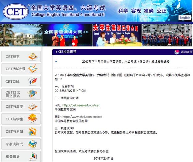 據(jù)全國大學(xué)英語四、六級考試委員會辦公室發(fā)布的通知,2017年下半年全國大學(xué)英語四、六級考試(含口語)成績今天發(fā)布!