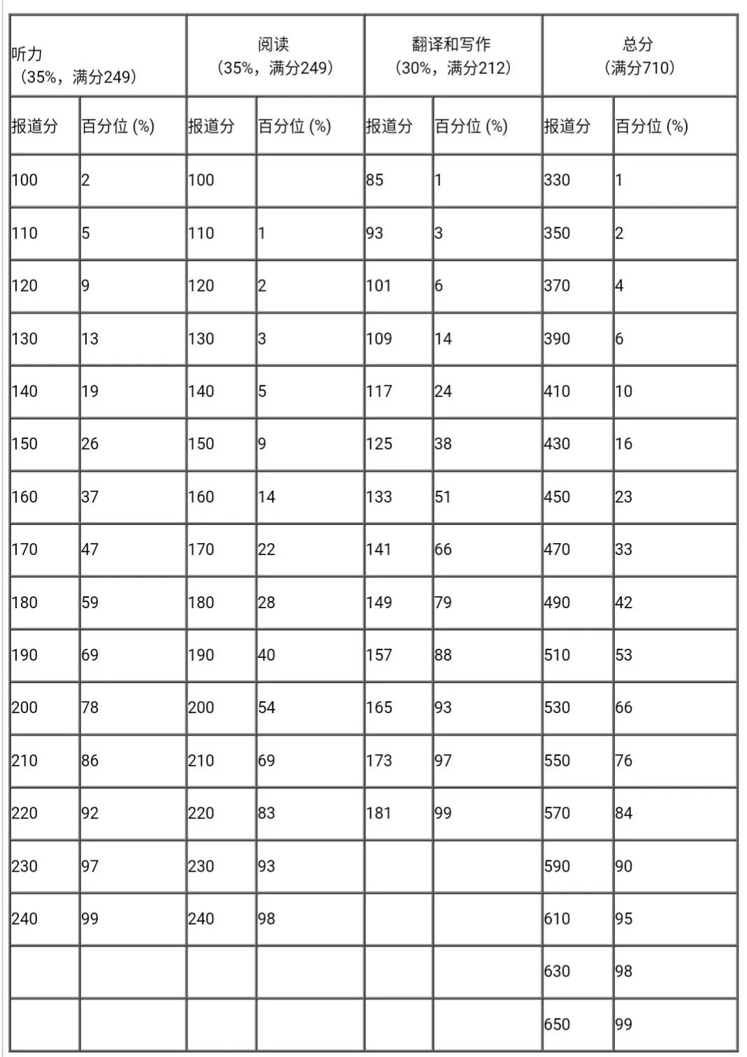 每次考試等值后的卷面分?jǐn)?shù)都參照常模轉(zhuǎn)換為報(bào)道分。四、六級考試報(bào)道總分為710分,計(jì)算公式為: