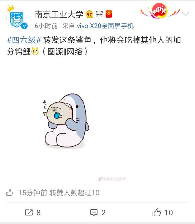 然而!南京工業(yè)大學(xué)官方微博不走尋常路,轉(zhuǎn)發(fā)鯊魚,吃掉其他人的錦鯉: