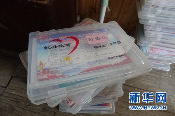 村委辦公室中的“精準(zhǔn)脫貧文件箱”,扶貧干部每月走訪(fǎng)時(shí)需攜帶并記錄。新華網(wǎng) 卓越 攝