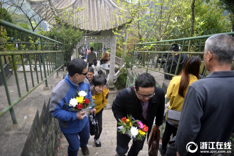 4月5日清明節(jié)上午,前往浙江省定舟山市定海區(qū)清陵掃墓人絡(luò)繹不絕,不少掃墓人用鮮花祭祀,寄托哀思懷念逝去的親人,倡導(dǎo)環(huán)保綠色的清明。(浙江在線拍友 胡社友 攝)
