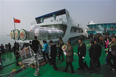 2018年4月2日,天津市濱海新區(qū)國(guó)際郵輪母港碼頭,全國(guó)首艘骨灰海撒專用船“國(guó)賓9號(hào)”首航,來(lái)自北京的逝者親屬們正排隊(duì)登船。新京報(bào)記者 王飛 攝