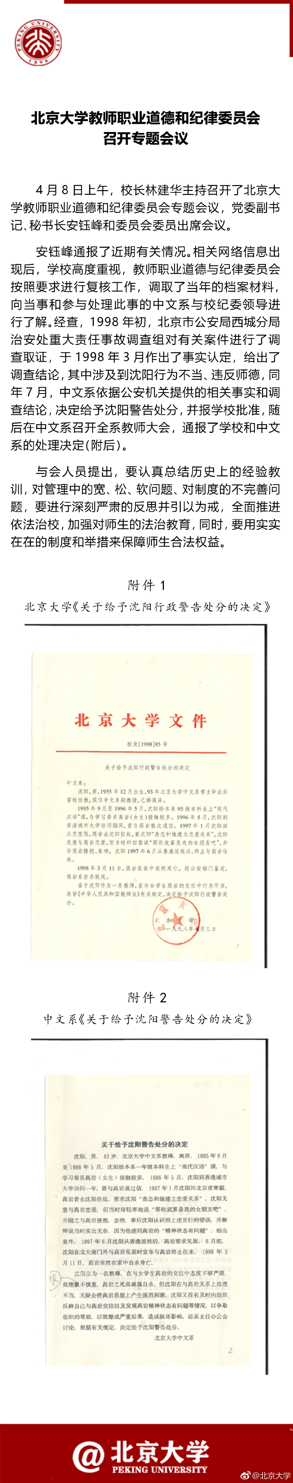 據(jù)北京大學(xué)官方微博消息,北京大學(xué)教師職業(yè)道德和紀(jì)律委員會(huì)今日召開專題會(huì)議 ,通報(bào)“沈陽事件”,并出示了當(dāng)年對其警告處分的決定。